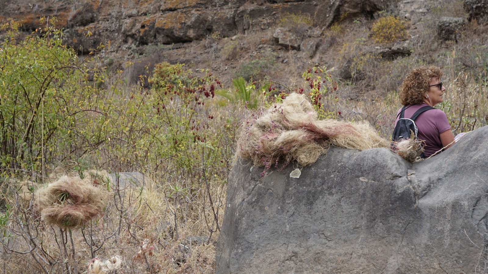 La intervención, al igual que la tela de la araña que puebla las tuneras, es un captador de aromas que descubrimos a lo largo de este recorrido, y que se concentran en ovillos o madejas de hilos y aromas entretejidos que se disponen alrededor de la gran piedra.